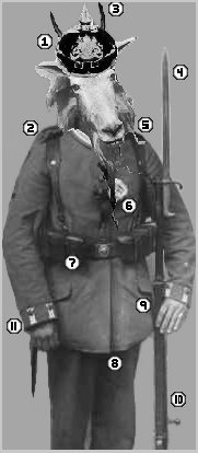 To better understand the WehrGoat, it is useful to examine a more typical specimen of the genus and compare it to our beloved blitz-mammal. Below, we compare a typical goat and a WehrGoat. Primary features and traits are identified. Pay particular attention to the lack of medals and awards on the ordinary goat's coat.