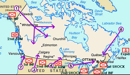 The objective of Operation Barn Storm is to cripple the Canadian transportation network, thus limiting their ability to transport defense forces, equipment and supplies. WehrGoat agents will slip across the border and infiltrate farms and ranches. Once in place, they will spread rumors of pending conquest, enslavement and torture. The residents will flee in fear and clog the roadways. |